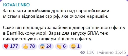 “За польоти російських дронів над європейськими містами відповідає СЗР РФ, яку очолює Наришкін. Саме він керував кабельними диверсіями тіньового флоту в Балтійському морі. Зараз для запусків безпілотників також використовують танкери цього флоту“, – заявив Коваленко.