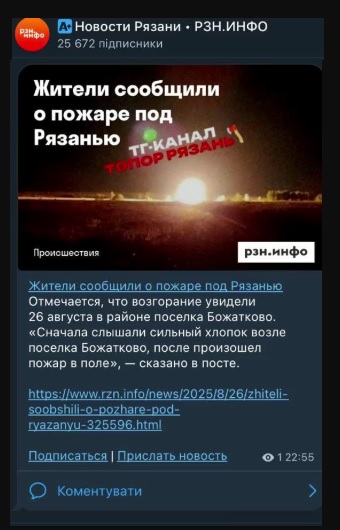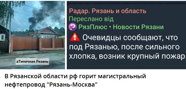 Нафтопровід Рязань-Москва, який постачав паливо на московський нафтопереробний завод у Капотні, був підірваний, за даними української розвідки, було припинено прокачування палива, виникла пожежа.