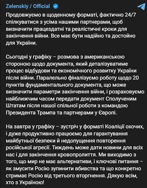 На завтра запланована зустріч у форматі “Коаліції охочих” — країн, які готові брати участь у довгостроковій системі безпеки, яка має запобігти повторенню російської агресії, новому вторгненню та спробам Кремля повернути вплив силою. Зеленський зазначає, що йде продуктивна робота щодо створення механізмів, які надійно утримають Росію від третьої війни проти України.
