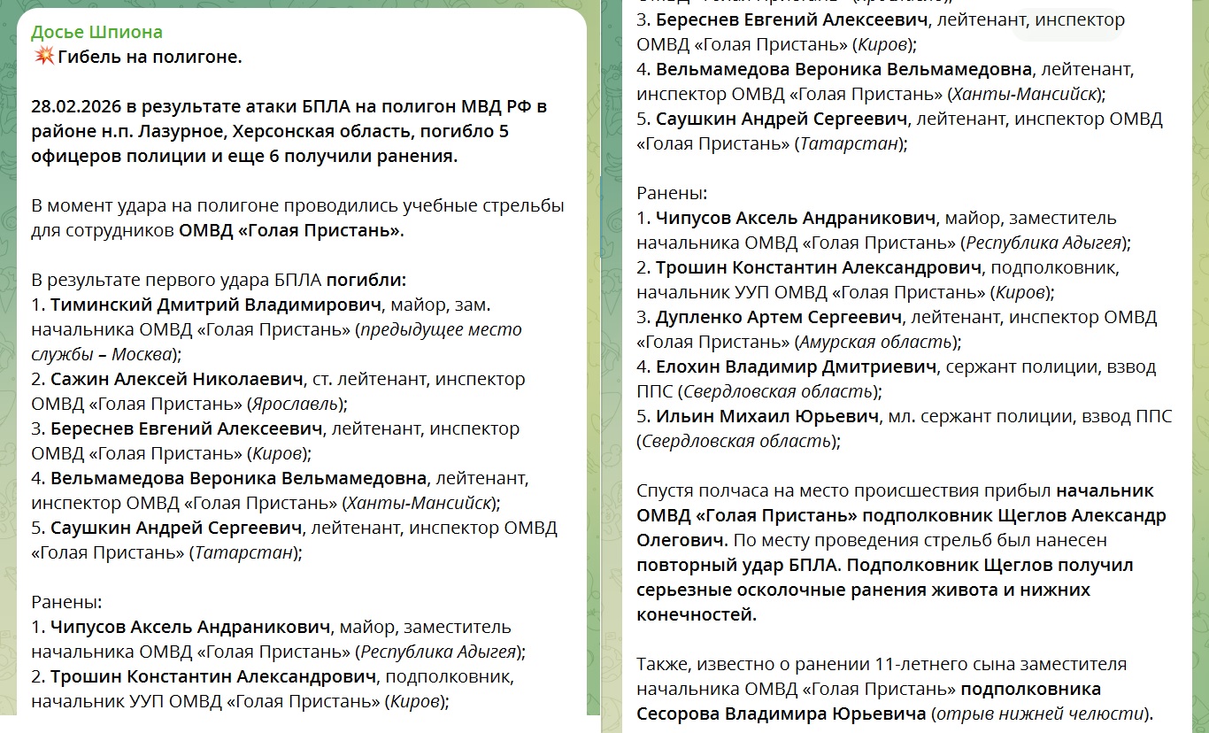 У Херсонській області 28 лютого безпілотник ЗСУ атакував полігон силовиків російського МВС у районі Лазурного під час навчальних стрілянин співробітників ОМВС “Гола Пристань”.