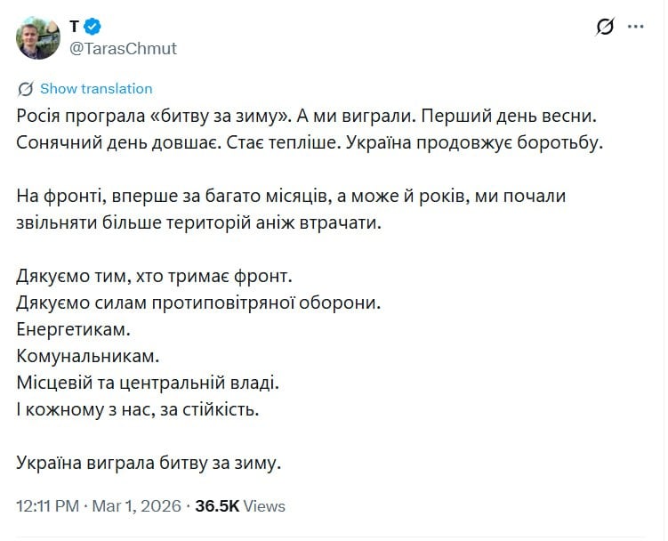 Голова фонду “Повернись до Живого” Тарас Чмут заявив, що Україна виграла “битву за зиму”, тоді як Росія свою кампанію провалила. Про це він написав першого дня весни.