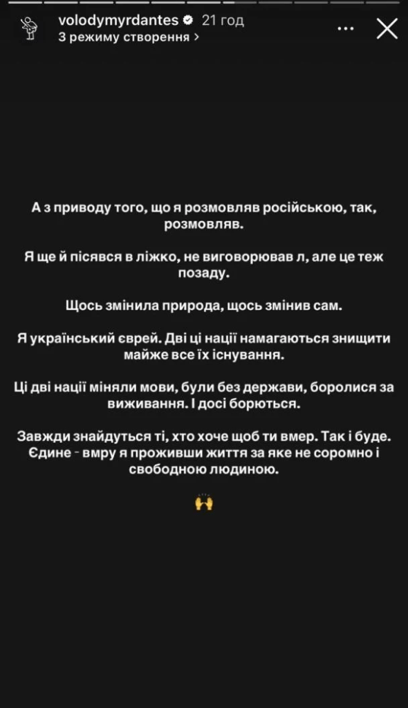 “А щодо того, що я розмовляв російською – так, розмовлявши. Я ще й пісявся в ліжко, не вимовляючи “л”, але це теж позаду. Щось змінила природа, щось змінила сама. Я український єврей. Ці дві нації намагаються знищити протягом майже всього їхнього існування. Ці дві нації міняли мови, були без держави, виборювали виживання. І досі борються. Завжди найдуться ті, хто хоче, щоб ти помер. Так буде. Єдине – помру я, проживши життя, за яке не соромно і свободним людиною”, – підсумував артист.