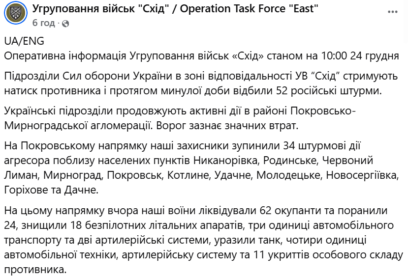 В Угрупованні військ «Схід» також повідомили, що за минулу добу Сили оборони України знищили 28 розрахунків російських безпілотних авіаційних комплексів. Підрозділи ракетних військ та артилерії виконали 836 вогневих завдань по позиціях противника.