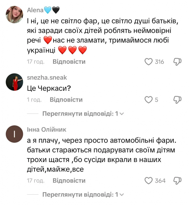 «Це не світло фар, це світло душі батьків, які заради своїх дітей роблять неймовірні речі», — написала користувачка Альона.