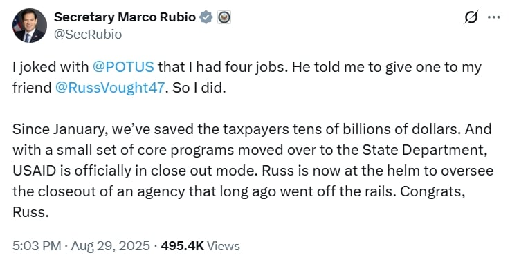 Глава Держдепу Сполучених Штатів Марко Рубіо 29 серпня офіційно оголосив про закриття Агентства США з міжнародного розвитку (USAID).