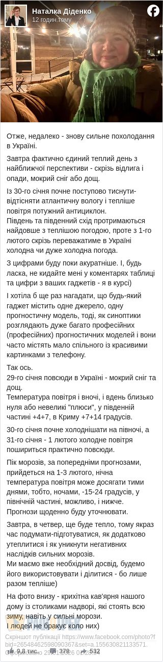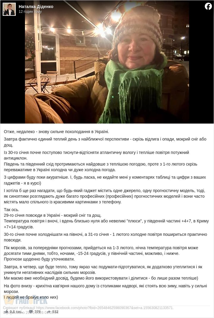 Спочатку градуси знизяться на Півночі, а вже 31 січня – 1 лютого холодне повітря пошириться й на інші області, повідомила синоптик Наталка Діденко.