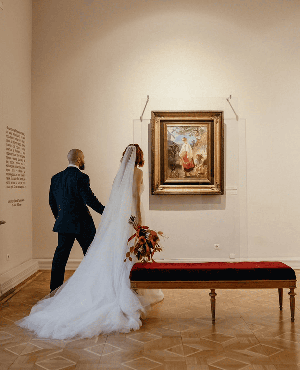 На опублікованому фото Валерій позує у класичному костюмі, поруч — його рудоволоса наречена у стриманій білій сукні з довгим вельоном. Пара стоїть спиною до камери й дивиться на картину Тараса Шевченка «Катерина».