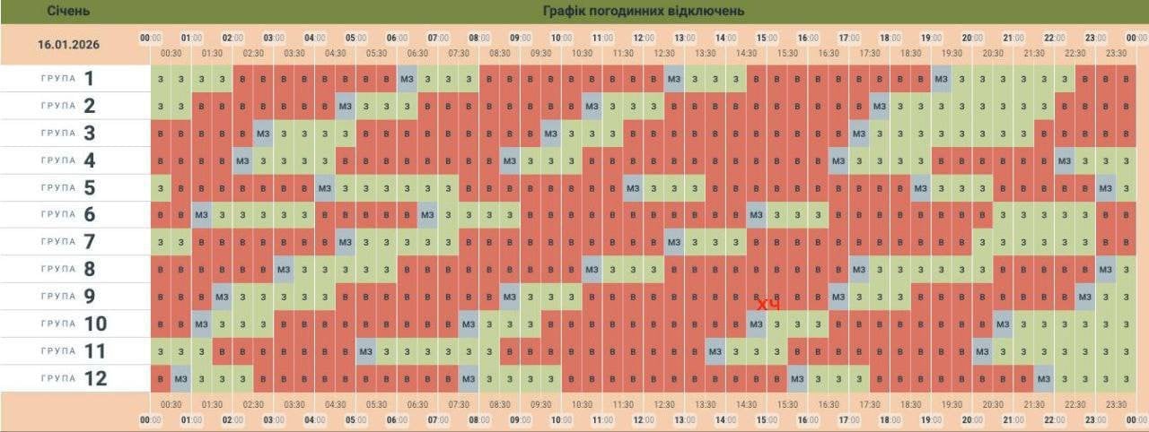 Завтра, 16 січня, будуть діяти графіки погодинних відключень світла з 00:00 до 23:59 (за умови скасування екстрених відключень).
