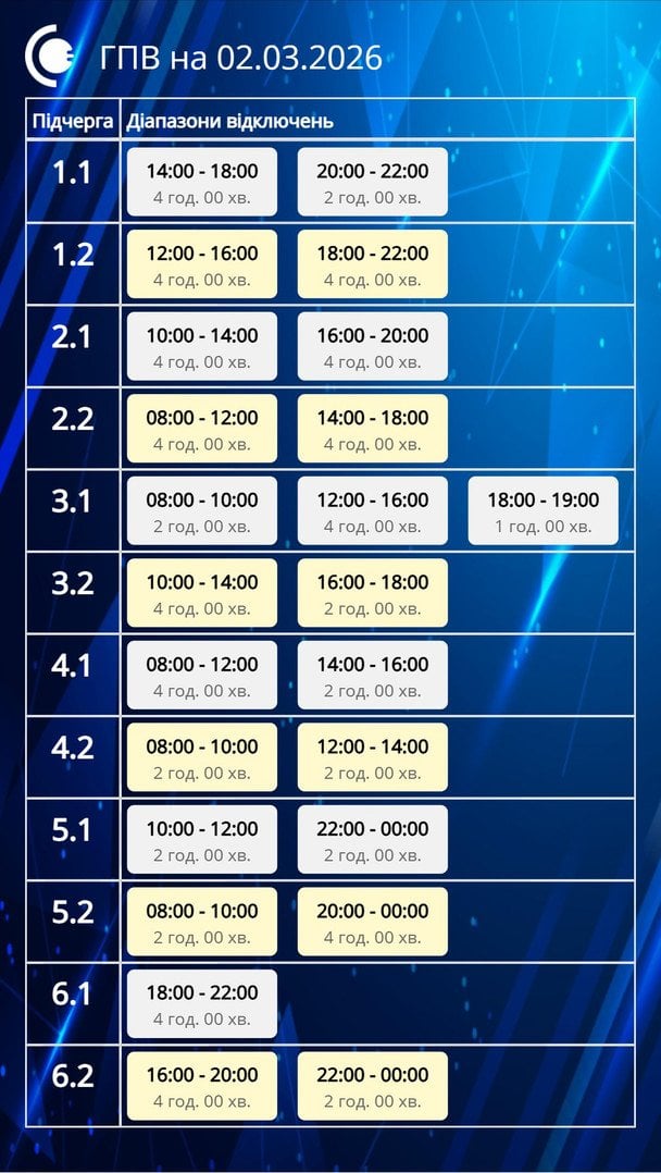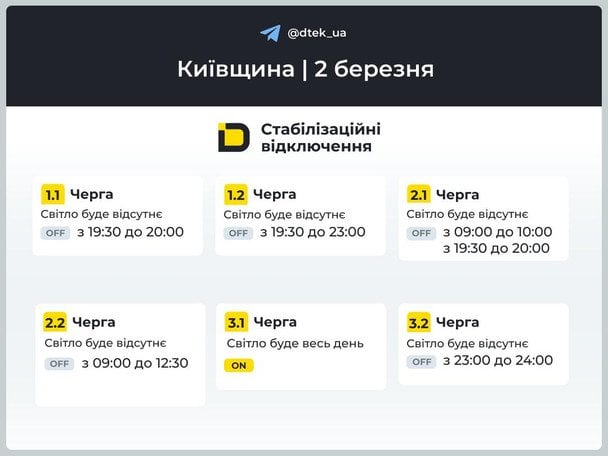 Через наслідки російських масованих ракетно-дронових атак на енергооб’єкти України у понеділок, 2 березня, у частині регіонів України будуть запроваджені графіки погодинних відключень світла.