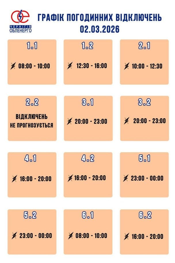 Як повідомили у «Чернігівобенерго» в області застосовуватимуть графіки погодинни відключень. Світла у помешканнях не буде від 2 до 3,5 годин. В одній із груп світло обіцяють упродовж усієї доби.