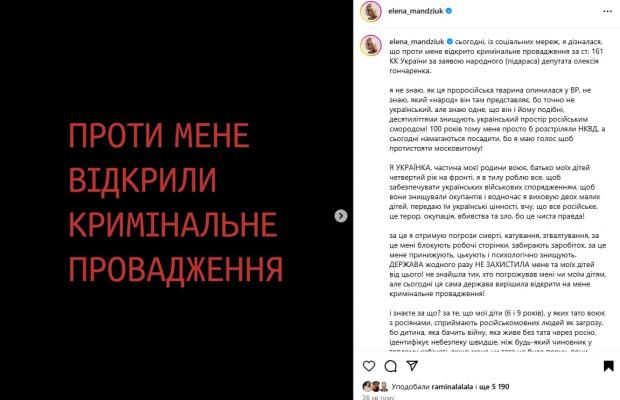 Мандзюк додала, що за свою позицію дістає погрози й терпить приниження. “Держава жодного разу не захистила мене та моїх дітей від цього, але сьогодні ця сама держава вирішила відкрити на мене кримінальне провадження! І знаєте за що? За те, що мої діти сприймають російськомовних людей як загрозу, – обурилася блогерка. – То скажіть, кого тут утискають? Чому в тилу українців цькують за ненависть до всього російського? Чому держава закриває очі на проросійську нечисть?”