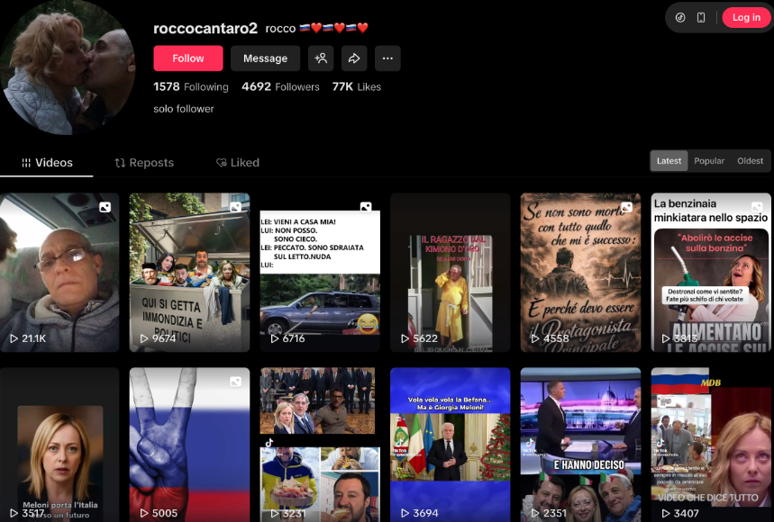 Тим часом у мережі знайшли ймовірний профіль Рокко у TikTok. Окрім своїх фото чоловік виставляє серденька з російськими прапорами та меми з європейськими політиками, зокрема італійською премʼєркою Джорджією Мелоні.