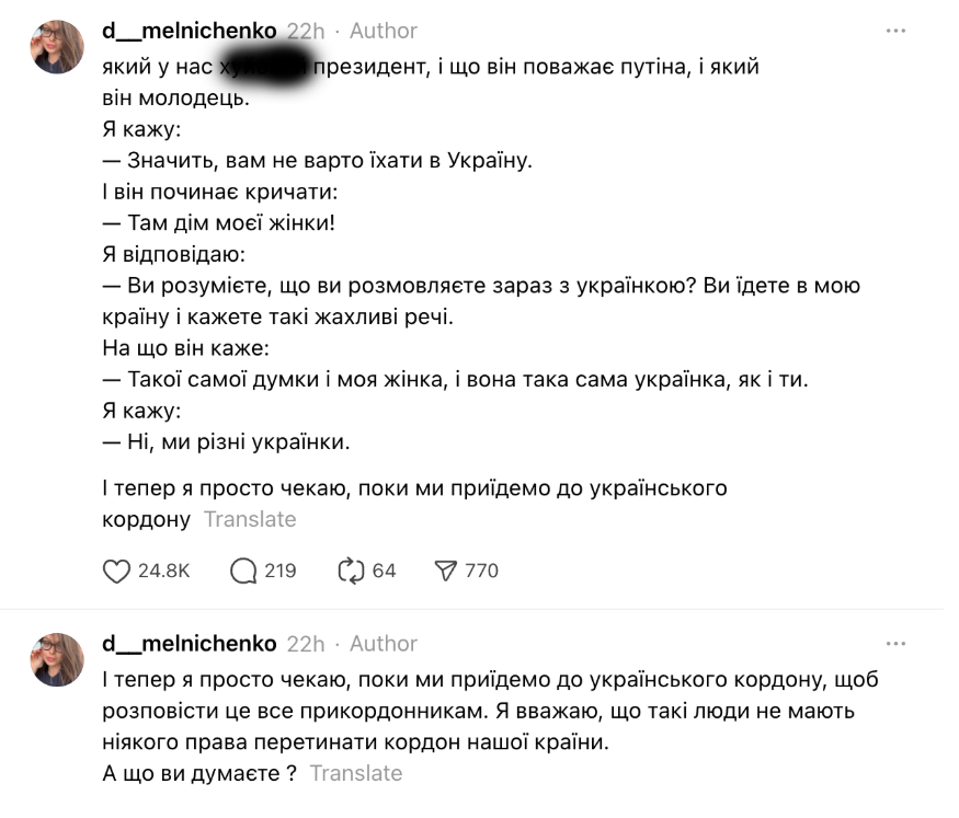 “Він починає мені розказувати, яка ху*ова в нас країна, який у нас ху*овий президент, і що він поважає Путіна, і який він молодець… Я йому пообіцяла, що на кордоні ми підемо разом і я підійду до прикордонників! Я зроблю все! Я ляжу, але воно не заїде в Україну!”, — пише пасажирка.