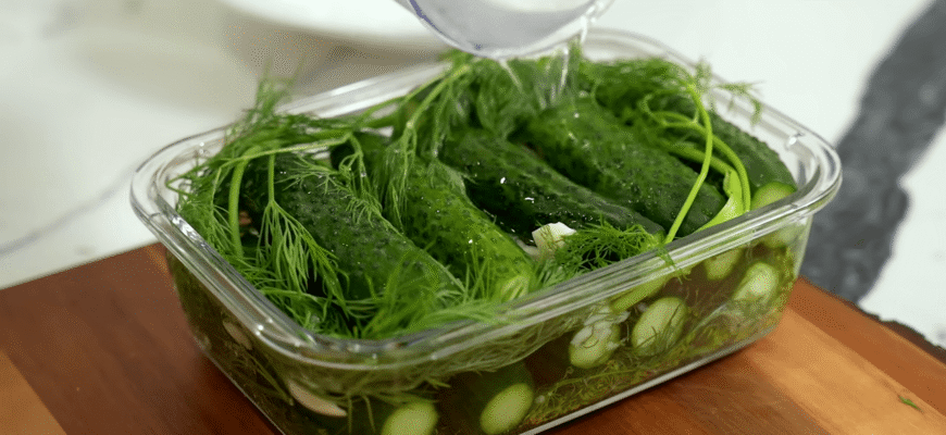Спершу огірки треба ретельно помити. Якщо вони здаються вам трохи вʼялими і не сильно пружними, то замочіть їх у холодній воді на годину. Тим часом на 1 літр чистої води (краще брати ледь теплу або кімнатної температури) потрібно взяти 2 столові ложки солі та 1 чайну ложку цукру для балансу смаку. У пакет або контейнер покладіть кілька зубчиків розчавленого часнику та трошки кропу за бажанням.