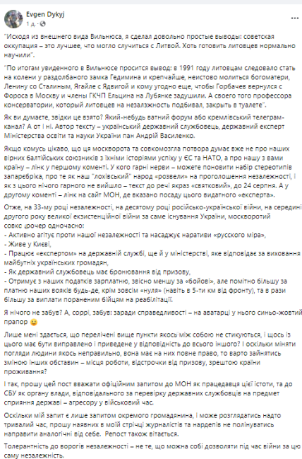 Також щодо цієї ситуації та заяв чиновника з МОН висловився військовий та політичний аналітик, ветеран АТО та громадський діяч Євген Дикий. На своїй сторінці у Facebook він опублікував пост, у якому розкритикував слова Андрія Василенка.