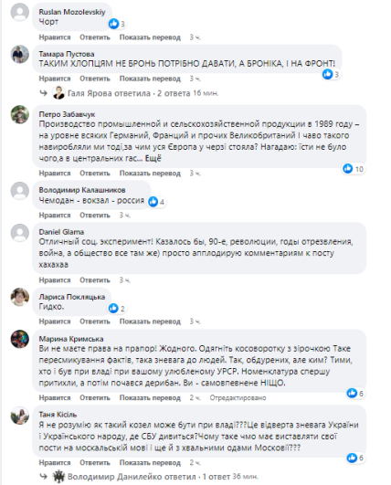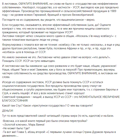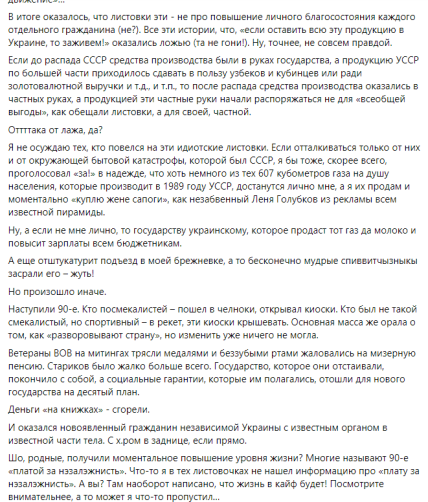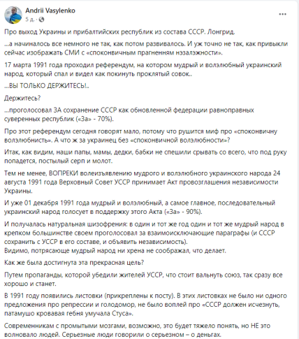 Також у своєму посту він розповідає про те, що на референдумі 17 березня 1991 року 70% громадян проголосували “за” збереження СРСР “як оновленої федерації рівноправних суверенних республік”, але після “пропаганди”, вже на початку грудня, 90% людей були за проголошення незалежності України.
