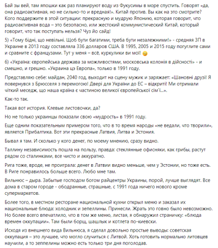Водночас він називає радянську окупацію “найкращим”, що трапилося з Литвою, а Вільнюс — “діркою, деколи гіршою за забуті Богом райцентри України”.