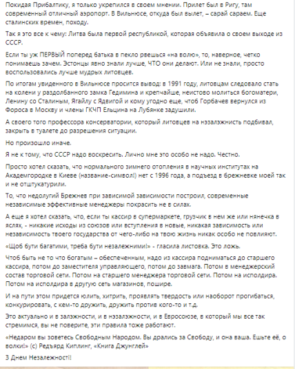 24 серпня, у День Незалежності України Андрій Василенко опублікував у Facebook пост, в якому він перекручає українську мову, наприклад, називаючи слово “незалежність” — “нэзалэжность”, при цьому називаючи її “кидаловом”. На його думку, 1991 року народ нібито нічого не розумів і шляхом пропаганди його вдалося переконати, що “варто лише усунути союз, то відразу все добре стане”.