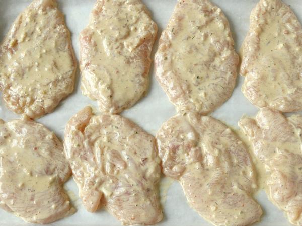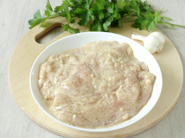 Накрийте м’ясо харчовою плівкою і акуратно відбийте. Потім помістіть куряче м’ясо в глибокий посуд, залийте маринадом і залиште на 1-2 години.