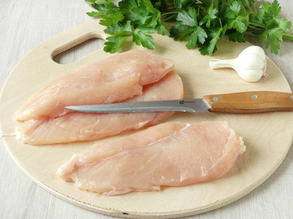 Промийте куряче філе, висушіть його за допомогою паперового рушника і наріжте тонкими пластинами.