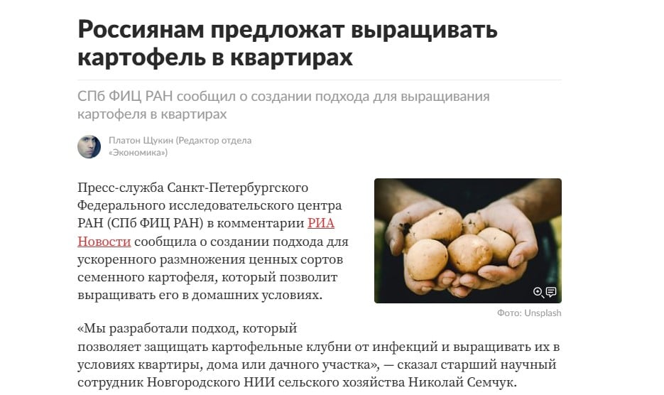 Як пишуть росЗМІ, в Російській академії наук нібито вигадали метод, що дозволяє швидко вирощувати картоплю в домашніх умовах, у тому числі в квартирах.