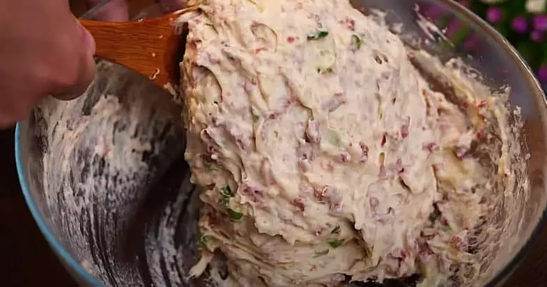 У мисці змішую яйце, сіль, цукор. Додаю кефір, перемішую. Просіюю борошно, замішую до однорідності. Салямі та сир натираю на терці, змішую з тістом. Також додаю подрібнену зелену цибулю та соду, перемішую.