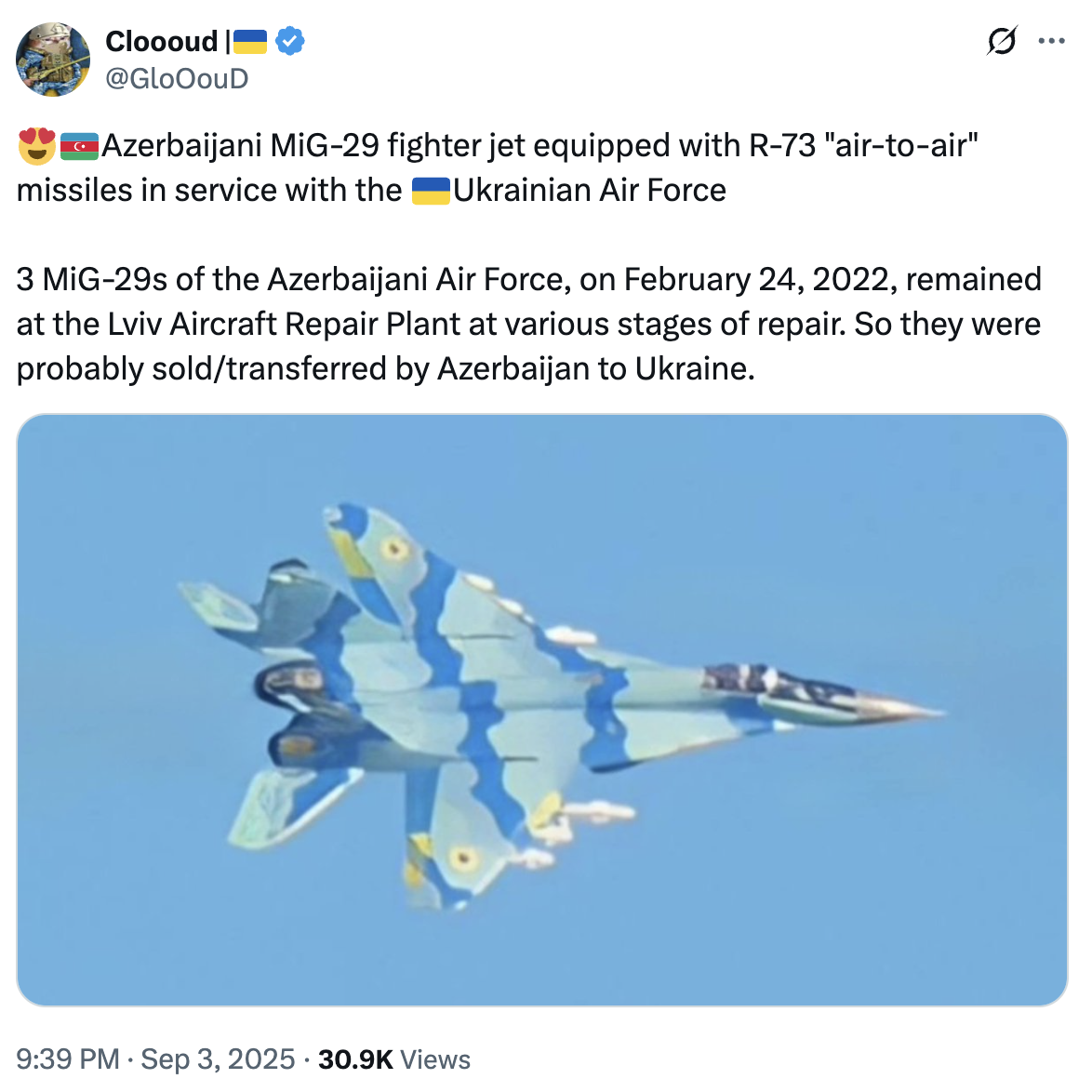 У небі України було зафіксовано винищувач МіГ-29 із камуфляжем та перефарбованими знаками, характерними для авіації Азербайджану. Це може означати, що українські повітряні сили отримали підкріплення у вигляді літаків, які раніше належали Баку.