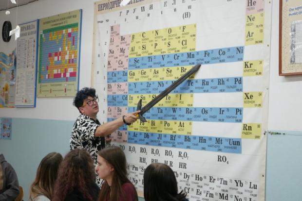 Біля столу – гільза, яку чоловік придбав на аукціоні, а поруч – великий меч, який він використовує, як указку. «У дев’ятому класі в нас є класична тема, коли ми вивчаємо спирти та їхню шкідливість. Я дітям пропоную знайти лайфхаки, як пити й не п’яніти. І починаю пояснювати, як впливає кожен з них. Вони мають розуміти не просто, що це – зло, а чому. Завдання хіміка: пояснити, як воно працює. І паралельно я їм пояснюю, як його добувають в промислових межах. Ми ставимо бражку, настоюємо, є апарат, в дистиляції ми отримуємо там п’ять мілілітрів того спирту, і вони розуміють, як цей процес виходить», – говорить вчитель Юрій Пахомов.