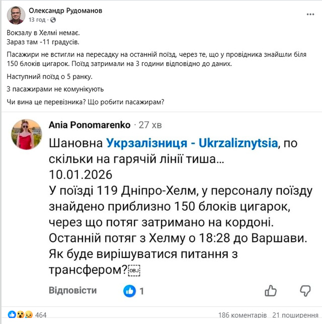 Це однозначно повністю вина перевізника, який має заплатити пасажирам за готель у Холмі, за квиток на наступний потяг + компенсацію за зрив планів. Хай потім ці ж гроші відсуджують у свого провідника. Його, до речі, слід би звільнити із пожиттєвим забороною перенаймати безвідносно його майбутньої адміністративної/кримінальної відповідальності за спробу контрабасу.