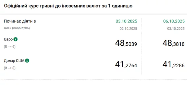 Офіційний курс на 6 жовтня 2025 року встановлено на такому рівні: 41,2286 гривень за 1 долар (-0,0478 грн).