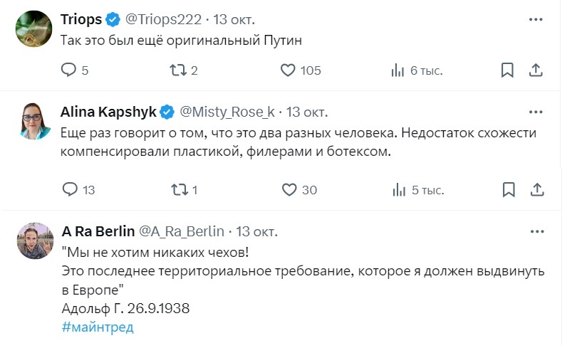 У соціальних мережах з’явилося архівне відео із заявами Путіна, який на той момент обіймав посаду прем’єр-міністра РФ. Під час телемосту «Москва – Київ» 9 жовтня 1999 року він зробив кілька заяв, які стосувалися Криму та України. Аудиторія була настільки вражена його словами, що передбачила реальну наявність двійників у глави Кремля. Фрагмент відео публікує Телеграм-каналУкраїна 365“.