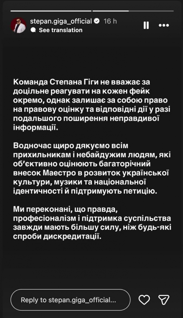12 січня на сторінці Степана Гіги прокоментували інцидент, заявивши, що артиста нібито намагаються дискредитувати. «Подібні інформаційні атаки ми спостерігаємо не вперше — починаючи з 2023 року. Імʼя народного артиста України Степана Гіги та його команди систематично намагаються дискредитувати шляхом поширення фейкових матеріалів, маніпулятивних скриншотів і непідтверджених тверджень. У жодному з випадків ці спроби не мали під собою жодних фактів і щоразу зазнавали повного провалу», — йдеться в повідомленні.