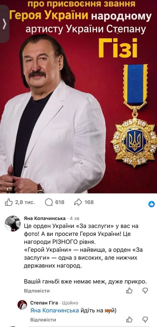 Яна Копачинська залишила коментар, у якому звернула увагу на невідповідність — родичі Гіги просять надати йому звання Герой України, але опублікували колаж, на якому зображено орден За заслуги. Жінка є дружиною загиблого військовослужбовця Владислава Зуська.