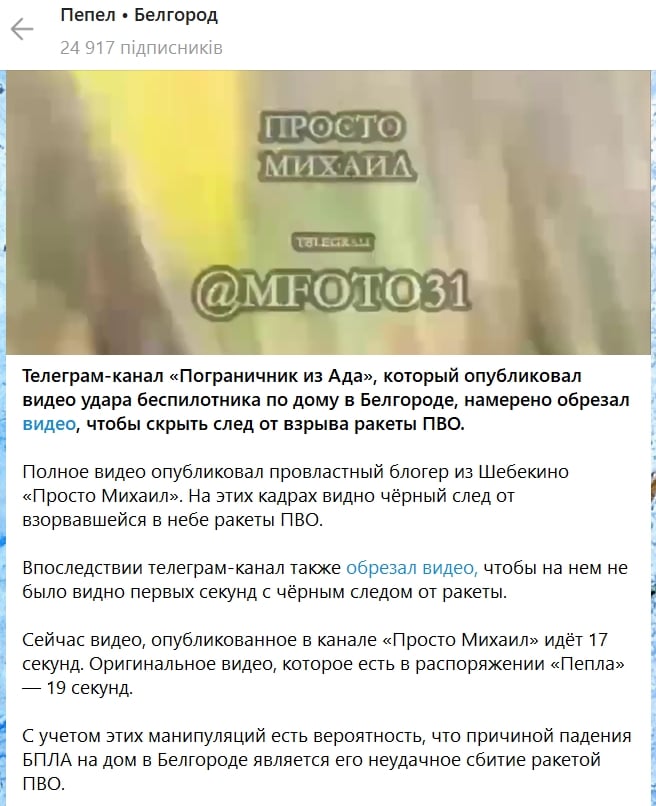 Першим відео влучення БПЛА багатоповерхівкою запостив провладний блогер з російського Шебекіно “Просто Михайло”. Тривалість початкового ролика становила 19 секунд. Відоміший Z-канал “Прикордонник з Ада” опублікував уже відредаговану 17-секундну версію. “Просто Михайло” оперативно оновив відео до більш короткого, і воно вже помчало далі пропагандистськими ресурсами.