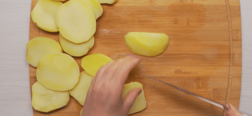 Після чотирьох хвилин у мікрохвильовці картоплю виймаємо і нарізаємо на дольки або кубики.