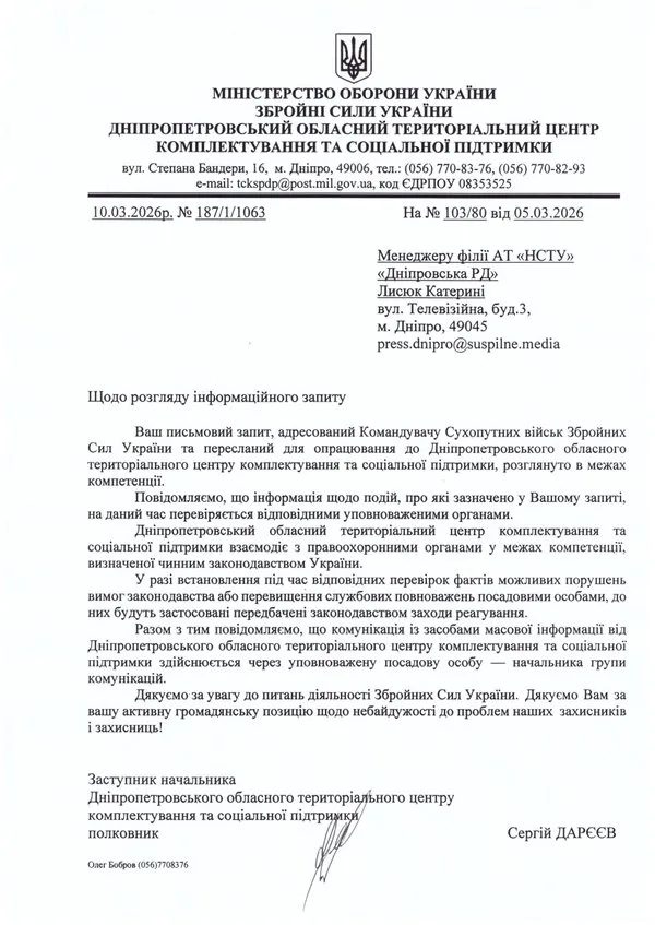 Офіційна відповідь ТЦК на запит журналістів щодо інциденту з ветераном / Суспільне Дніпро