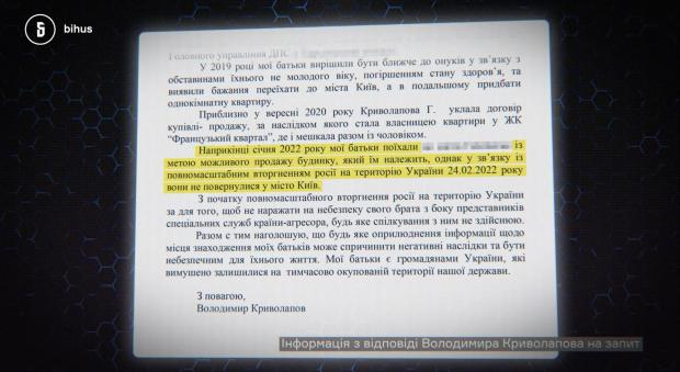 Розслідувачі додають, що Криволапови живуть у квартирі площею 140 квадратних метрів, вартість якої наразі складає близько 23 мільйонів гривень. За 8 років після придбання брат так і не взявся продавати цей актив. Сам Володимир Криволапов стверджує, що після початку повномасштабного вторгнення він припинив спілкуватися з братом, щоб не наражати його на небезпеку з боку спецслужб Росії.