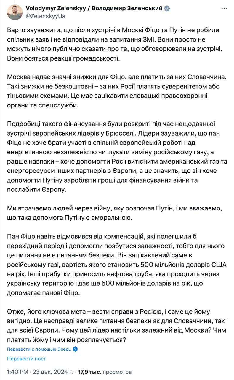 Зеленський виступив із різкою критикою прем’єр-міністра Словаччини Фіцо, який напередодні відвідав Москву заради переговорів із Путіним.