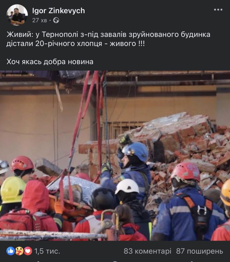 З-під завалів багатоповерхівки на вул. Стуса в Тернополі щойно рятувальники дістали живого 20-річного юнака.