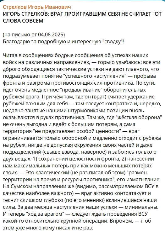 Лист, написаний Стрєлковим у в’язниці, був опублікований на його Telegram-каналі. У ньому РФ Z-патріот констатує — Росія зазнає серйозних невдач на полі бою.