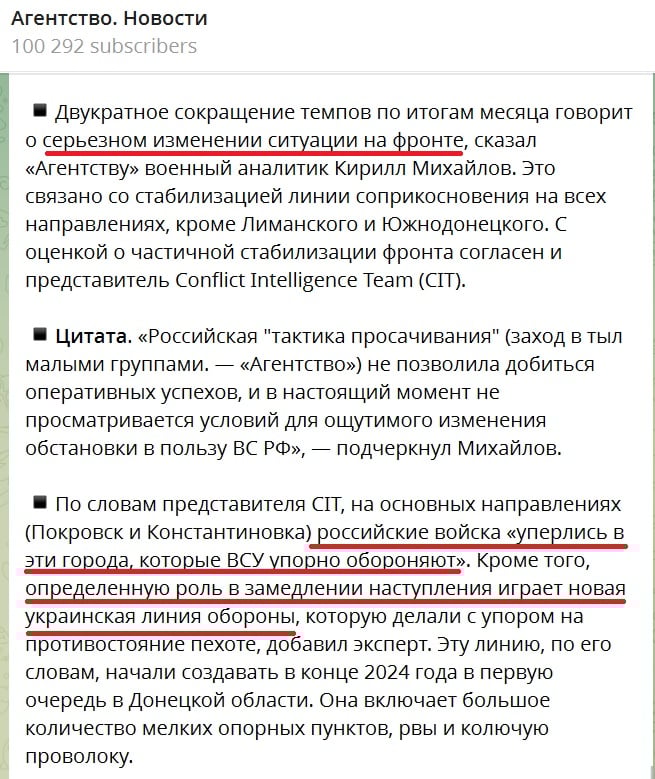 Військові аналітики зазначають, що уповільнення пов’язане із новими українськими оборонними спорудами, створеними ще наприкінці 2024 року. Лінія оборони включає десятки дрібних опорних пунктів, рови та загородження з колючого дроту. Експерти наголошують: саме ці зміцнення на Донеччині не дозволили Росії розвинути успіх на напрямках Покровська та Костянтинівки.