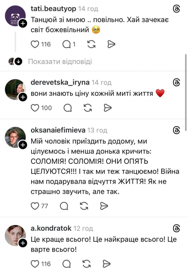 Інші користувачі додали, що «це краще всього і варте всього» та що «вони знають ціну кожної миті життя». Дружина захисника Оксана поділилась своєю історією: «Мій чоловік приїздить додому, ми цілуємось і менша донька кричить: „Соломія! Соломія! Они опять целуются!“. І так, ми теж танцюємо! Війна нам подарувала відчуття життя. Як не страшно звучить, але так».